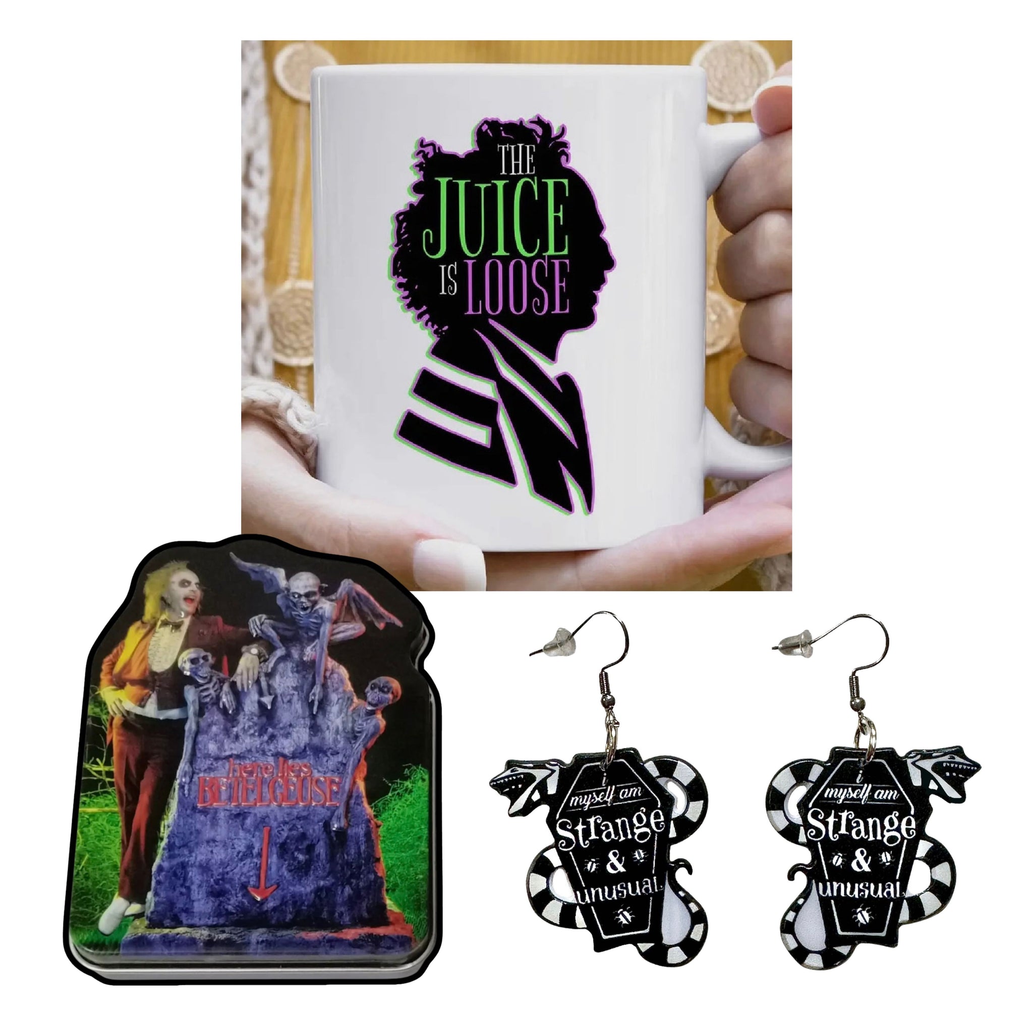 - (1) Beetlejuice themed ceramic mug (your choice of design: I Myself Am Strange And Unusual” Mug OR “The Juice Is Loose” Mug)
