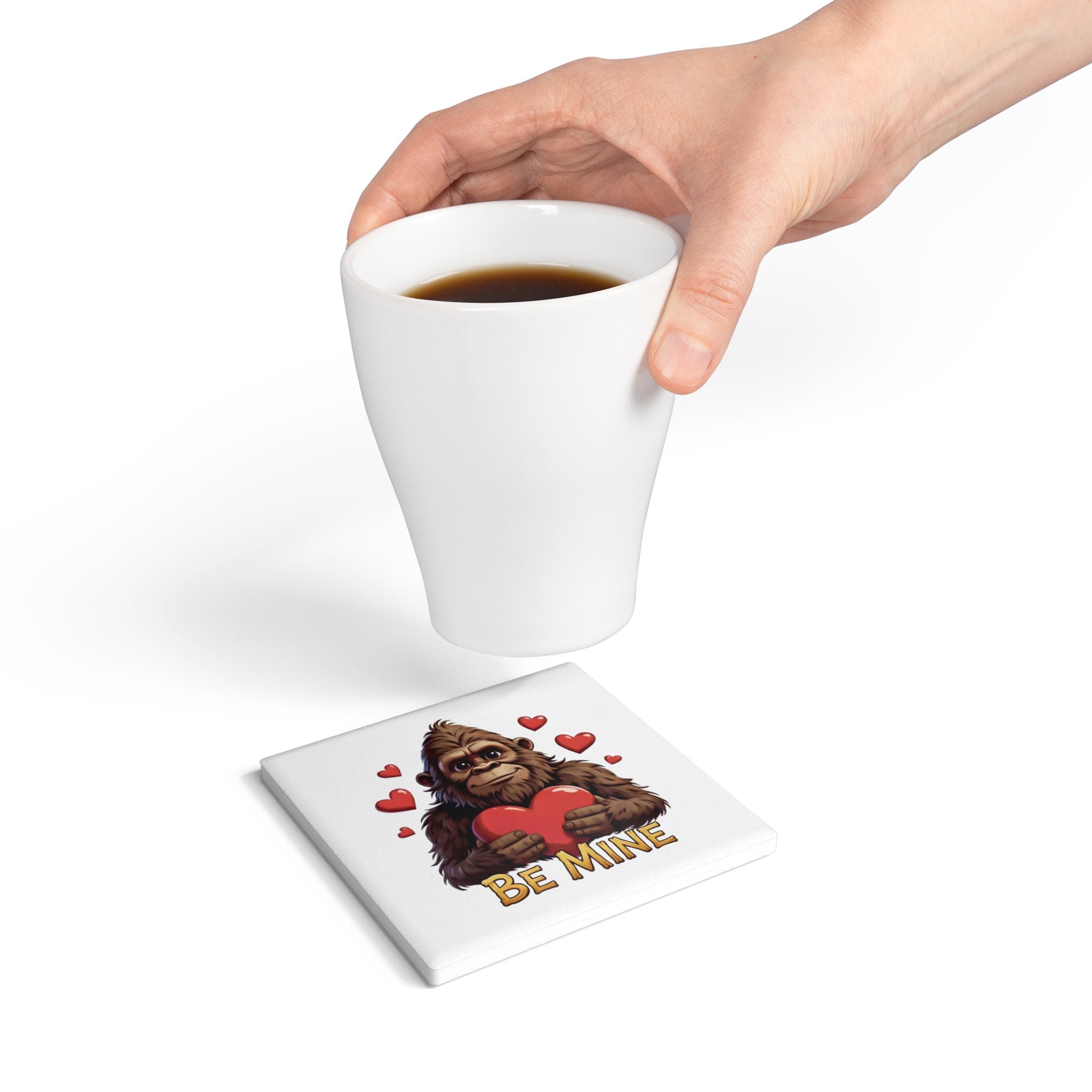 Bring a little big-footed charm to slow mornings and cozy evenings. This ceramic coaster features a sasquatch clutching a heart under a scatter of tiny hearts, with text that reads “BE MINE.” The smooth white ceramic face holds up to hot mugs and cold glasses, while the cork backing keeps drinks steady on wooden tables and nightstands. Wipe clean in seconds and let this playful coaster quietly brighten breakfast, movie nights, or a Valentine’s coffee date at home.