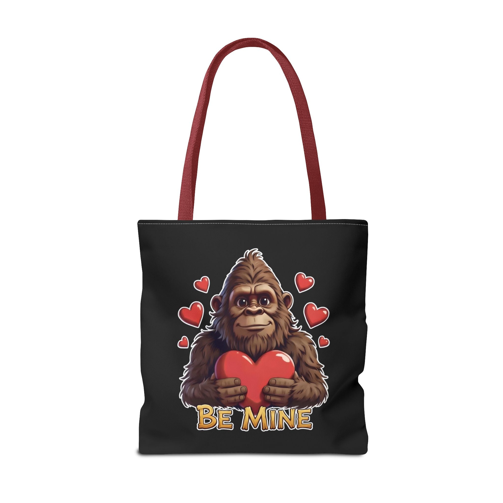 A roomy, everyday tote that carries a little cheeky charm. Softly structured yet durable, this polyester tote features a lovable Sasquatch clutching a heart with playful “Be Mine” lettering—an easy way to bring whimsy to errands, market runs, or a casual day out. The black background makes the illustration pop while boxed corners add depth for groceries, books, or a laptop. Reinforced handles and sturdy stitching keep the load secure, and five handle colors let you match mood or outfit. Lightweight, quick-drying, and built to travel from cafe to trailhead.