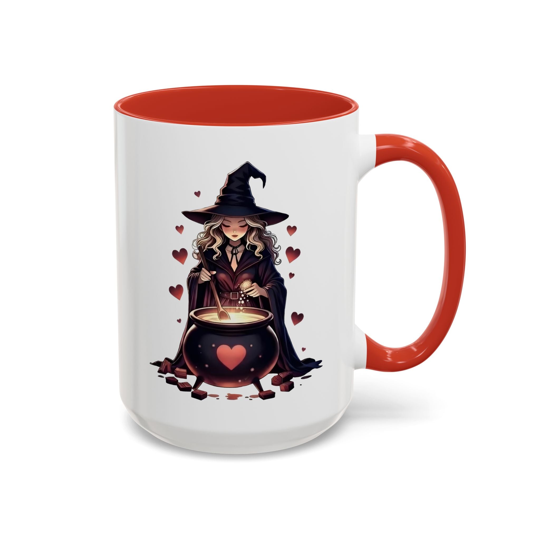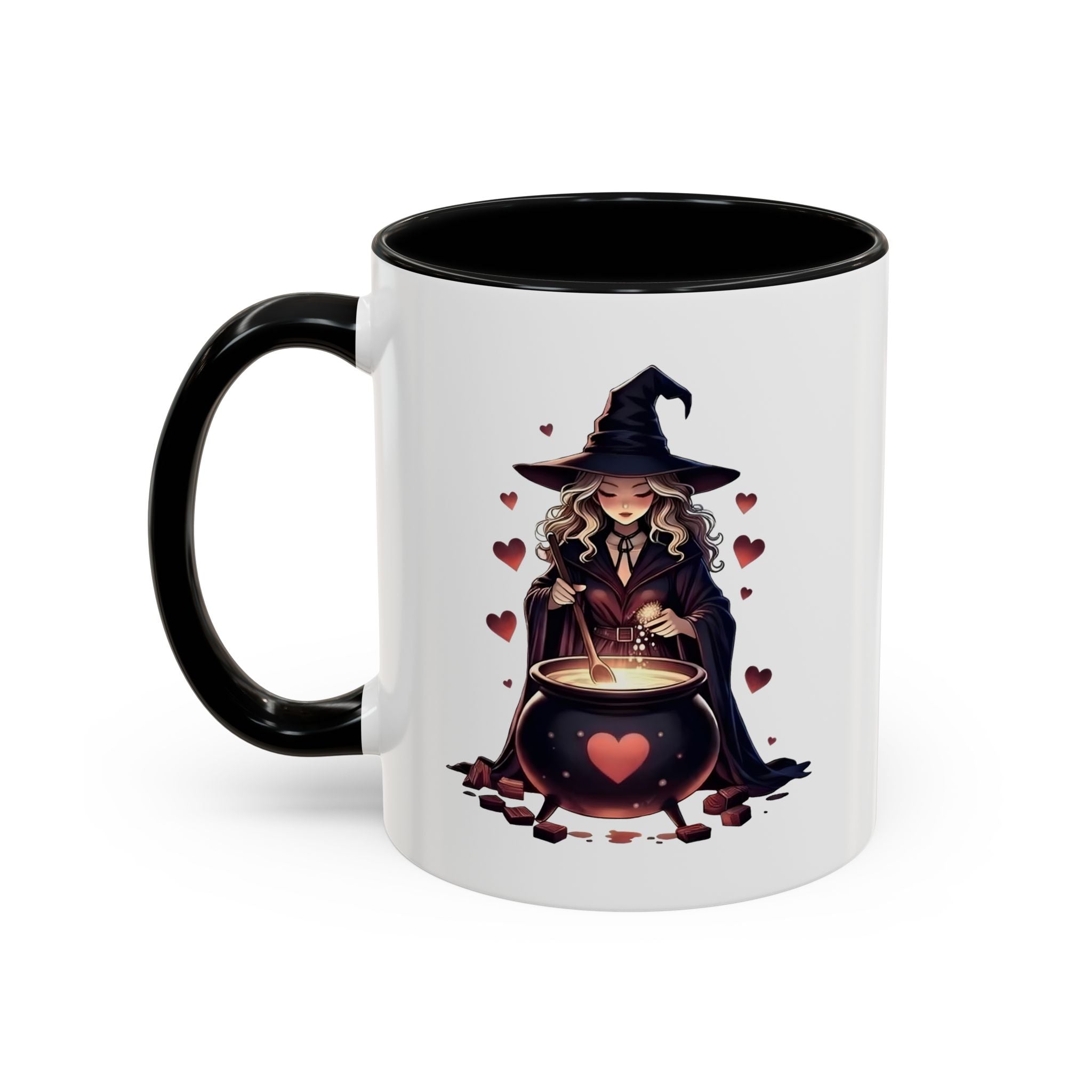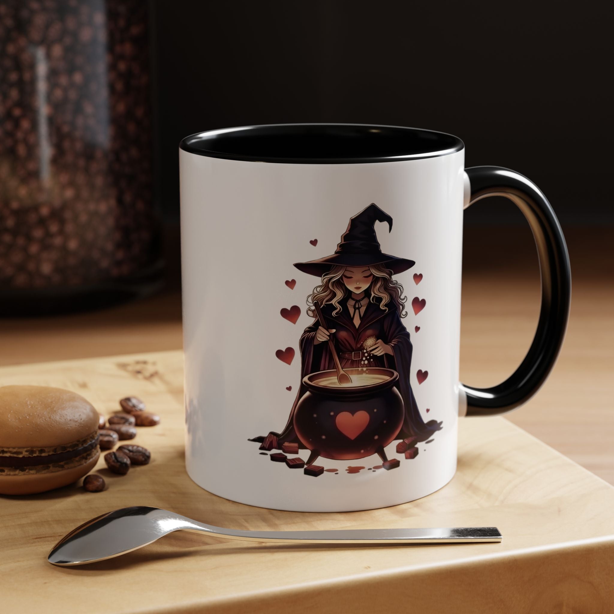 Warmth in every sip. This glossy ceramic mug pairs a vivid, witchy illustration with a bold colored interior and handle — a little cauldron of comfort for slow mornings and late-night brews. The artwork shows a beautiful spellcaster stirring a heart-emblazoned potion, surrounded by floating hearts. It brings a soft, whimsical energy to a cluttered desk, an apartment kitchen, or a window seat where ritual and routine meet. Lightweight enough for daily use, yet bright and sturdy enough to stand out in a collection. Whether it’s early-morning routines, quiet crafting nights, or a shared ritual of tea with a friend, this mug feels like a small charm you reach for when you want to settle in and savor the moment.