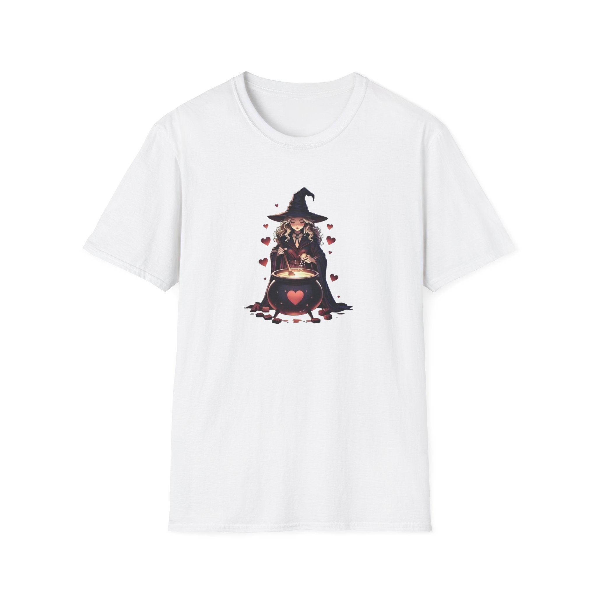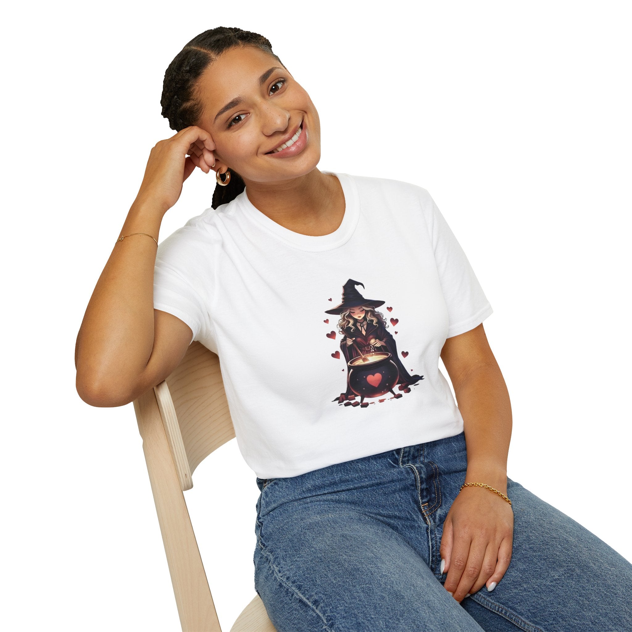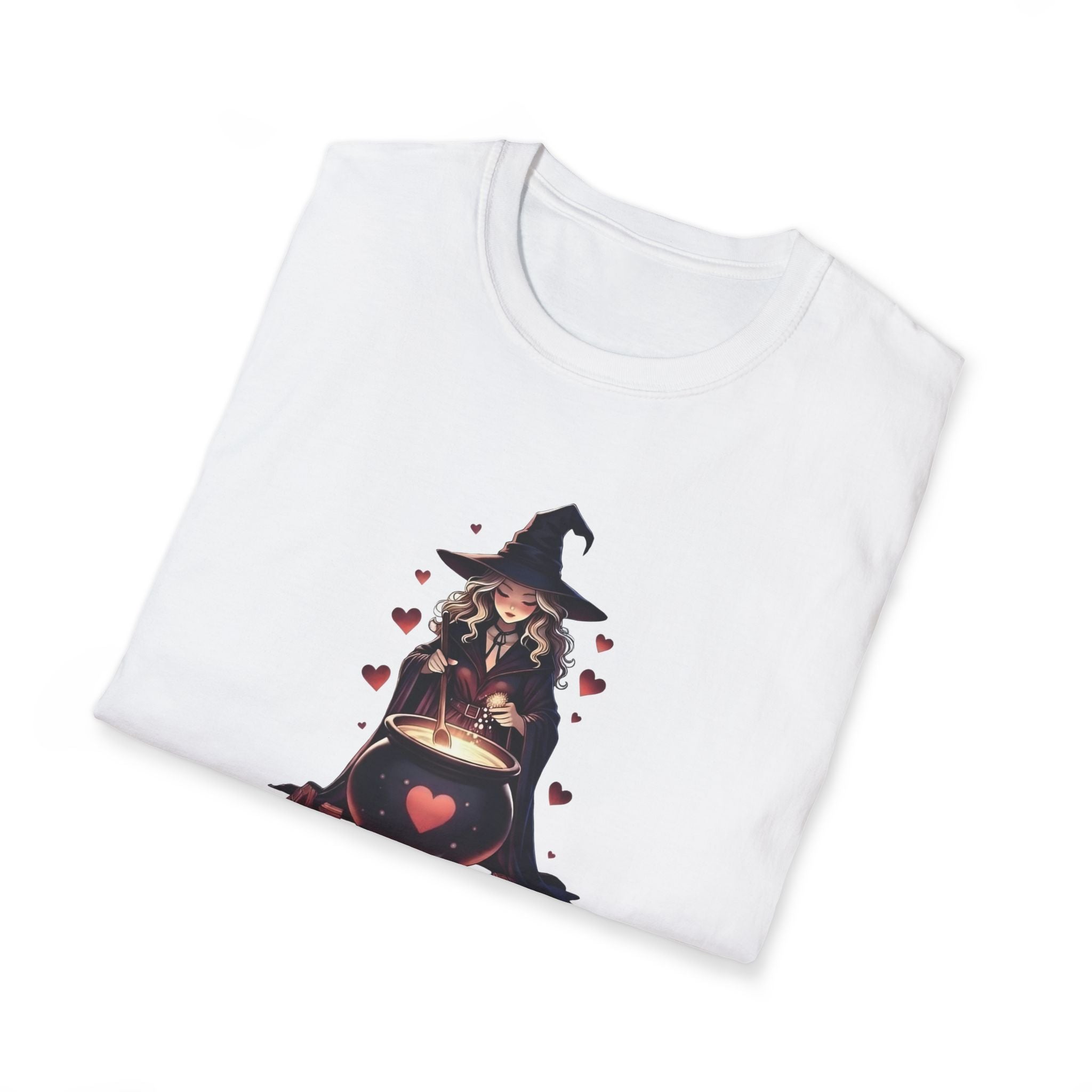 Soft, slightly worn-in cotton with a small, whimsical witch illustration centered at the chest — a warm cauldron surrounded by floating hearts. This tee feels like slipping into a quiet autumn evening: gentle, familiar, and a little bit magical. It’s cut in a classic crew silhouette that layers easily under jackets or pairs with high-waisted jeans for a cozy, off-duty look. Wear it to an evening walk through falling leaves, a low-key Halloween gathering, or anytime you want a touch of cottage-core witchiness without fuss. The print sits modestly on the chest so the design reads close and personal, inviting a smile from people who notice the small, charming details.