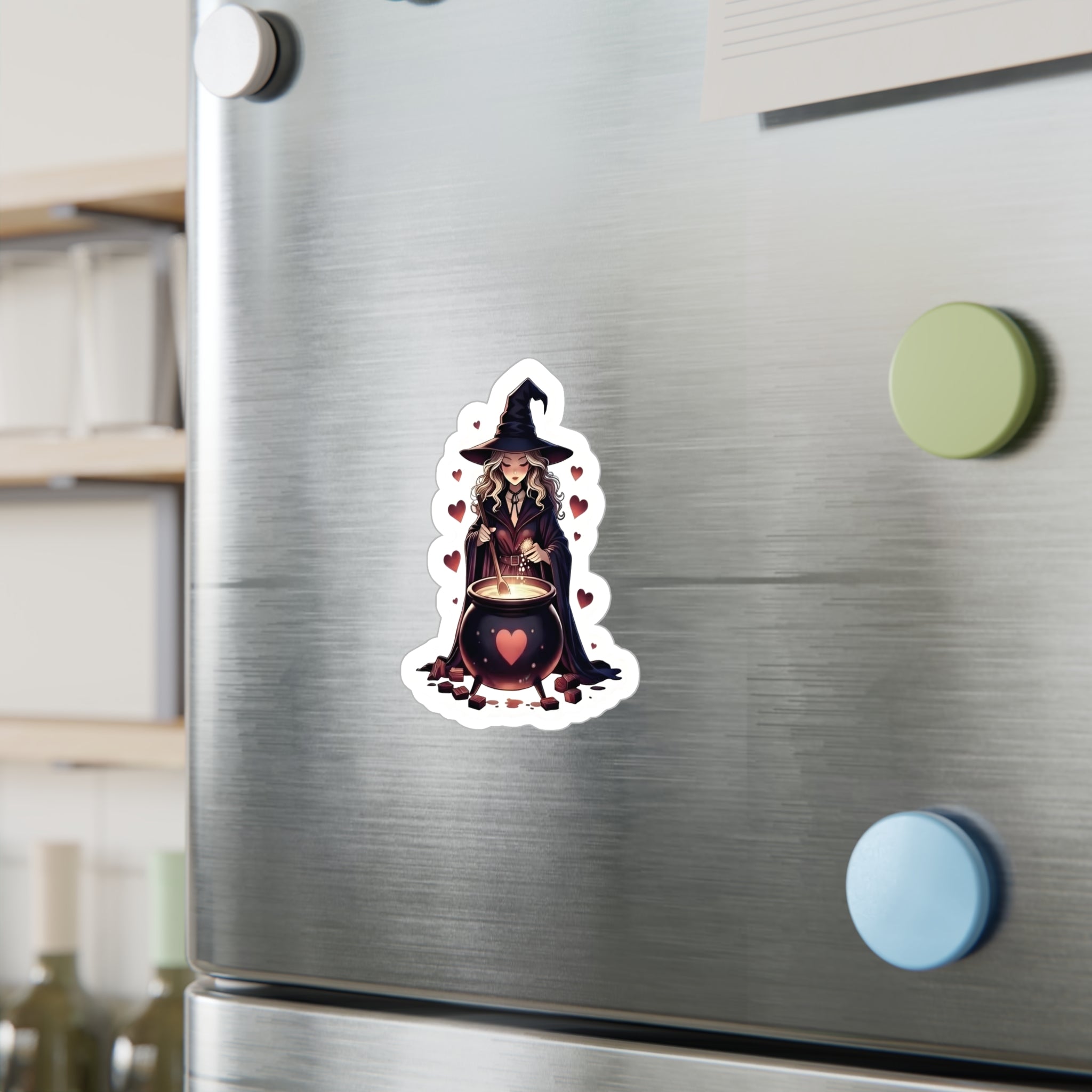 A small spell of charm for your things—this satin-finish vinyl decal shows a witch stirring a heart-marked cauldron, surrounded by drifting hearts. It feels cozy and whimsical, the kind of art that settles on a water bottle, laptop, or window and quietly changes the mood of whatever it touches. The soft satin surface keeps colors vivid without harsh glare, while the subtle white kiss-cut border gives the design a neat, hand-cut look. Weather-resistant and removable, it travels with you from rainy street corners to sunlit porches without losing its warmth.
