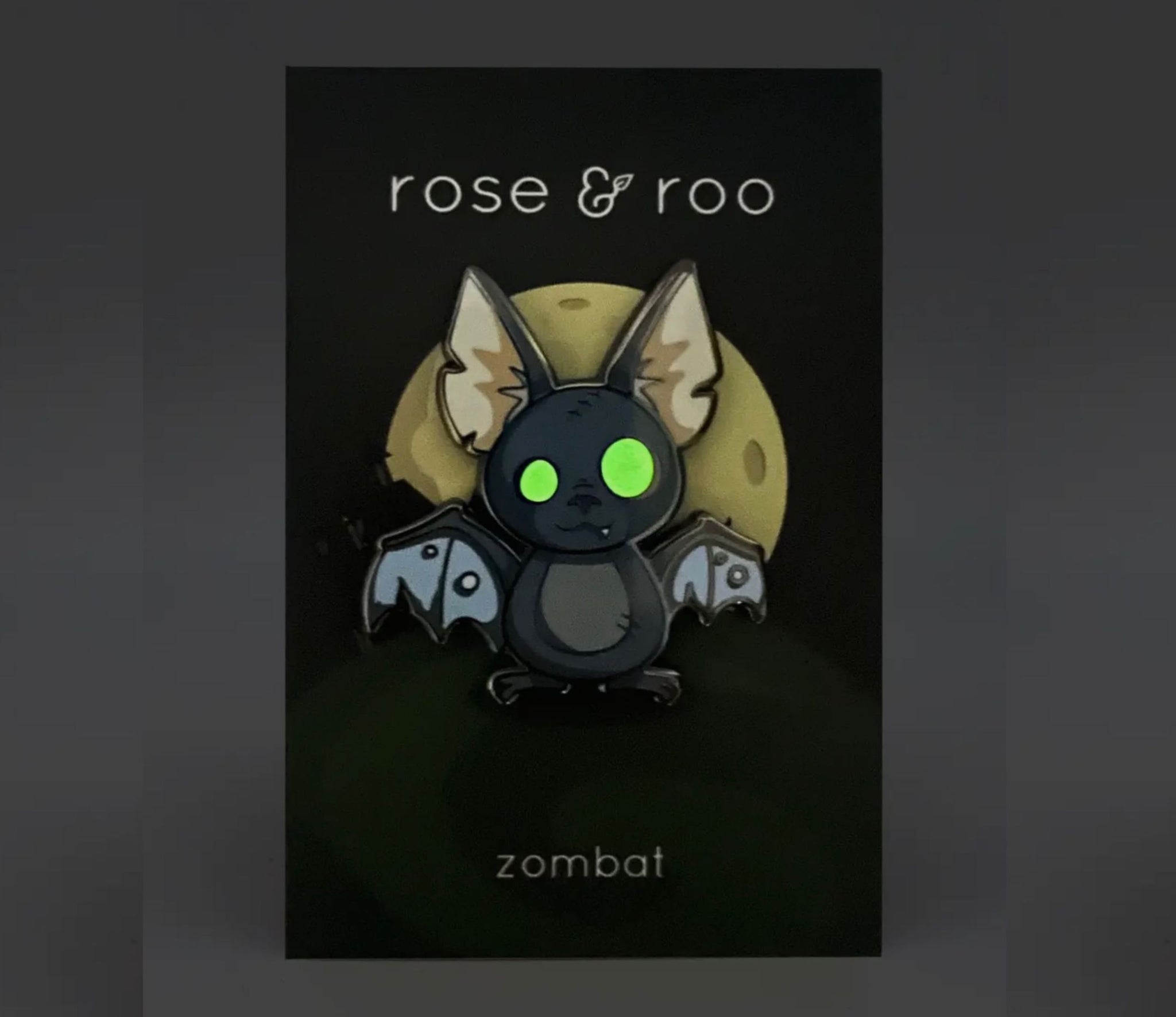 This hard enamel pin is black-nickel plated and features big GLOW-IN-THE-DARK eyes with silkscreened details. It comes with two yellow-green rubber clutches, and a super creepy backer card.